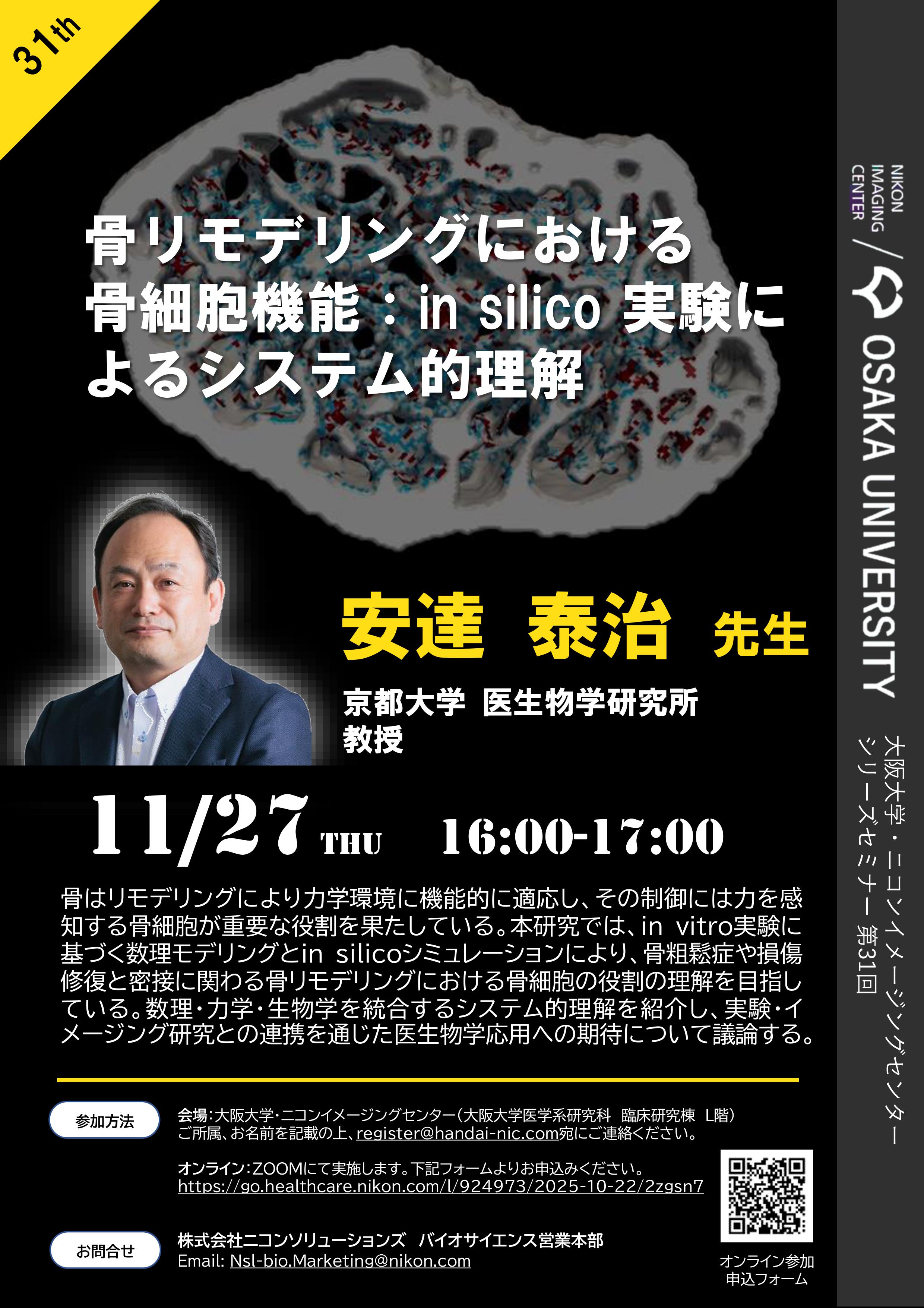 申込方法 | オンライン参加:下記のウェビナー申込フォームより、必要事項をご記入の上、参加登録をお願いします。https://go.healthcare.nikon.com/l/924973/2025-10-22/2zgsn7 会場参加:件名に「シリーズセミナー第31回 参加希望」と明記の上、本文にご所属、お氏名を記載いただき、こちら(register@handai-nic.com)のメール宛にお申し込みください。 |