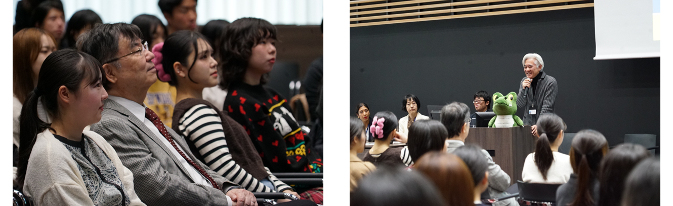 古谷大輔教授のレクチャーに真剣に耳を傾ける坂口特別栄誉教授と学生たち